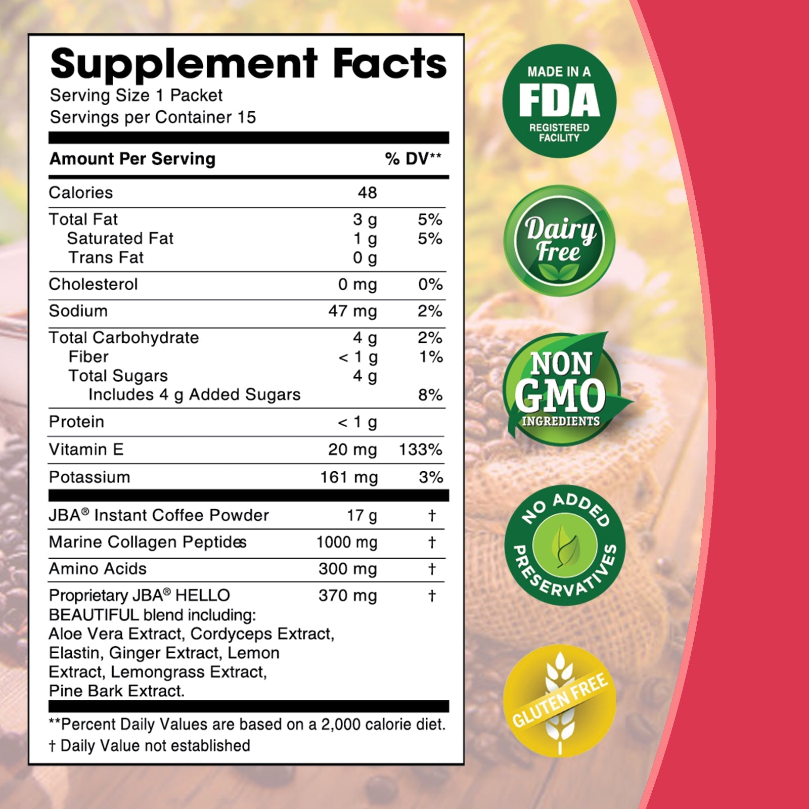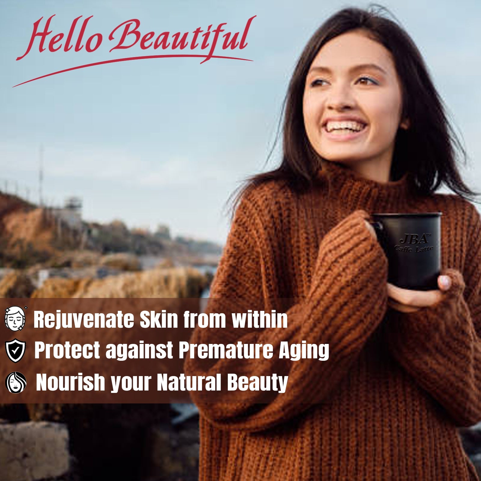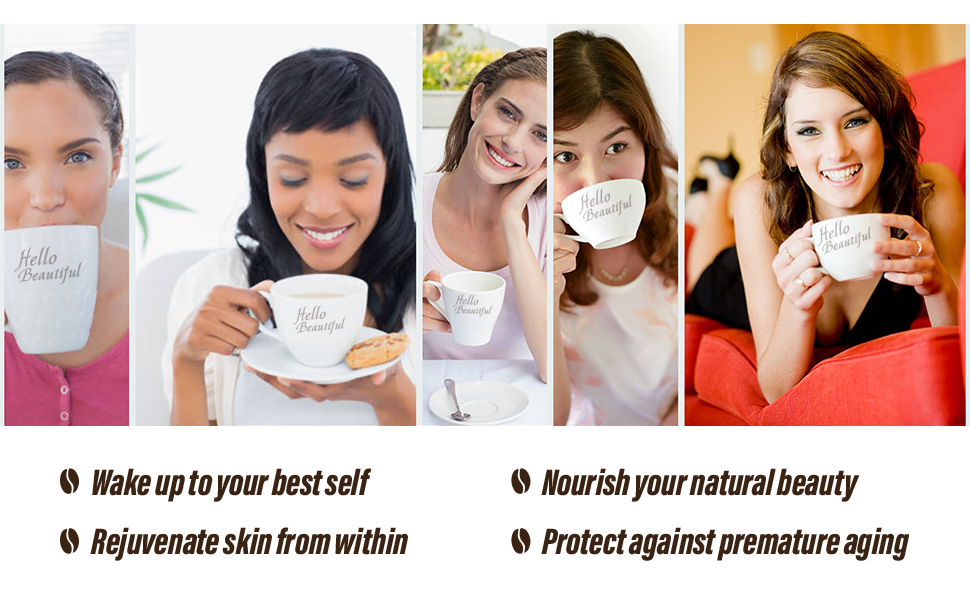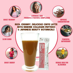 Awaken Your Dreams with a cup of JBA™ Hello Beautiful Functional Caffe Latte. This delicious, rich instant coffee is infused with 1000 mg Marine Collagen Peptides, skin-loving nutrients, traditional Japanese beauty botanicals for youthful, luminous skin.