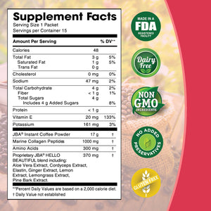 Awaken your dreams and embrace beauty from within with JBA™ Hello Beautiful Functional Caffe Latte. This luxurious, zero-sugar instant coffee is specially crafted for those who want to enjoy a delicious, creamy beverage without the added sugar. Infused with 1000 mg of Marine Collagen Peptides and a blend of skin-loving botanicals, this caffe latte is designed to support youthful, luminous skin and overall vitality.