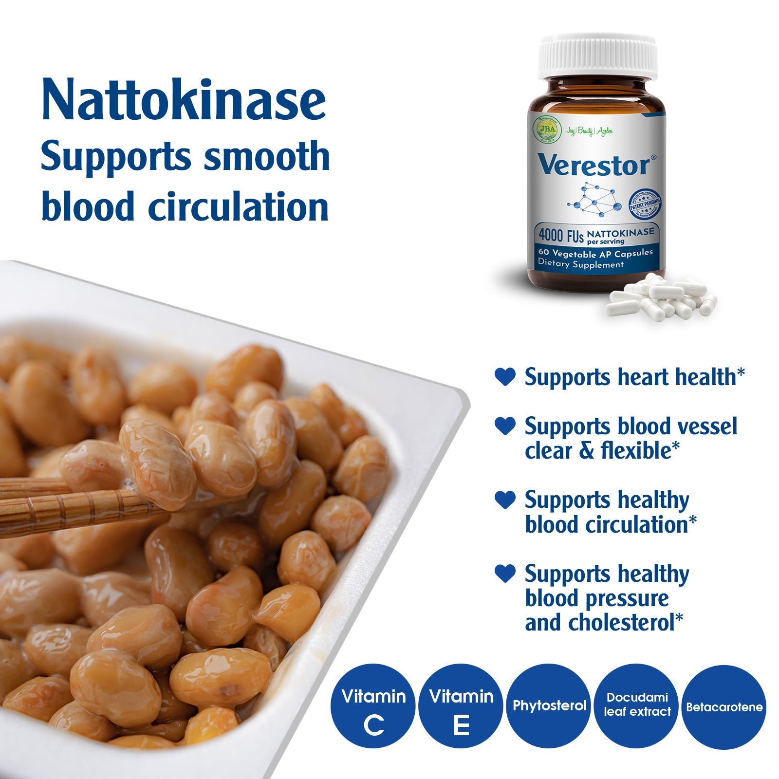 Verestor® contains Nattokinase 2,000 FU, with dokudami leaf that helps support healthy blood vessels*.